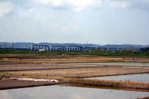 青海駅跨線橋から山側を 見る。 高速道路の高架の下に 新幹線の高架が姿を 現している。 |